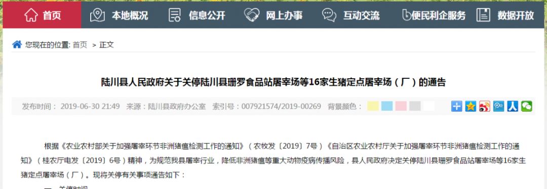 陸川縣關(guān)停了珊羅食品站屠宰場(chǎng)等16家生豬定點(diǎn)屠宰場(chǎng)(廠);